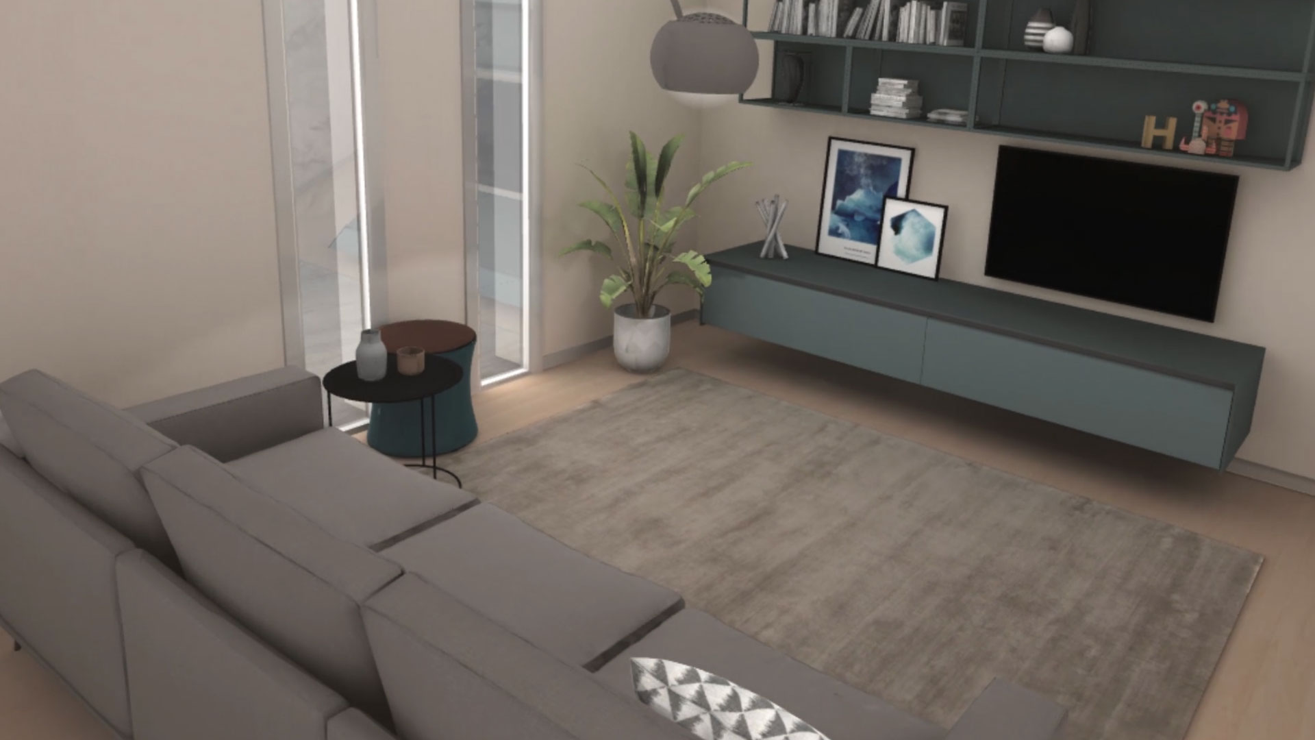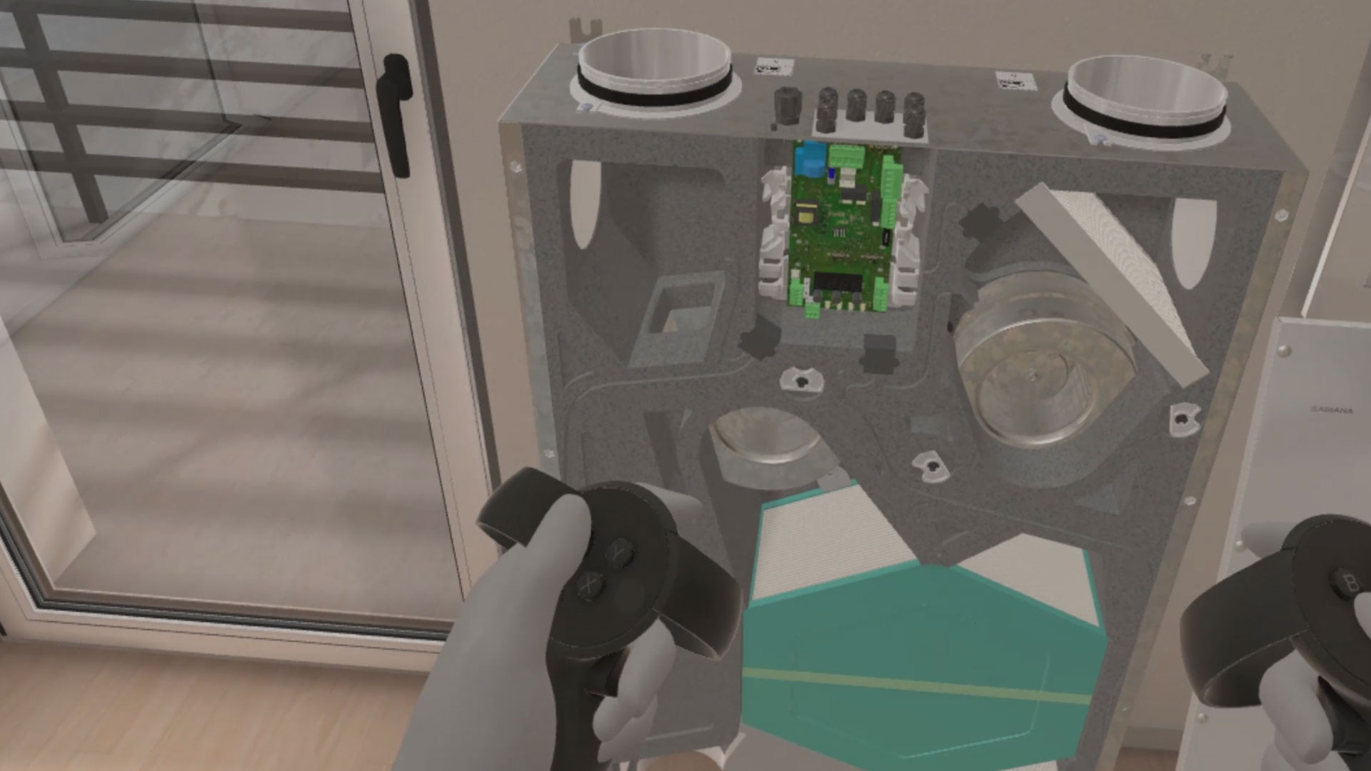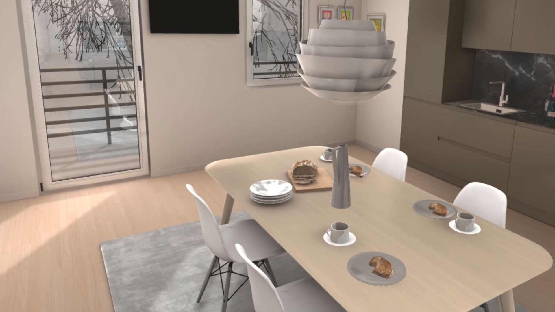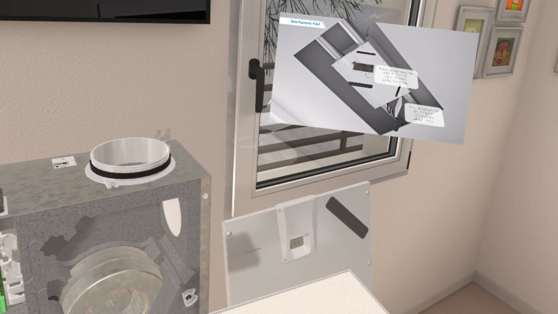 Un rendering 3D di un interno moderno, probabilmente un soggiorno o uno studio, con pareti chiare e un pavimento in legno. A sinistra, un quadro incorniciato appeso a una parete. Al centro, una porta-finestra che si affaccia su un paesaggio invernale, e sulla parete un televisore nero montato. In primo piano a destra, una mano virtuale con un controller VR grigio interagisce con l'ambiente. In alto, una botola sul soffitto.